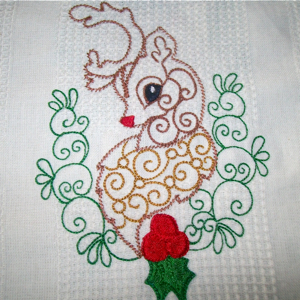 A fanciful colorline rendition of Rudolph the Reindeer. This design though quick stitching and virtually jump free is both simple yet bold through the use of decorative stitches and double runs to give great dimension to the thread. A perfect choice for numerous applications from clothing to home decor. The pictures as shown are Rudolph stitched on a waffle weave kitchen towel.